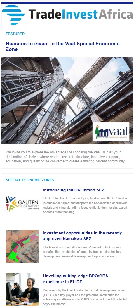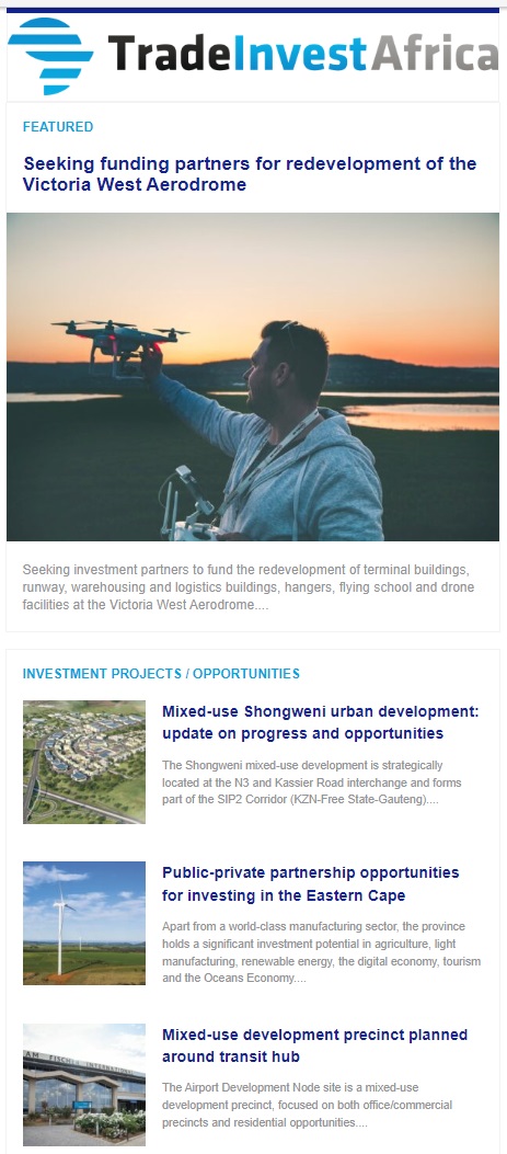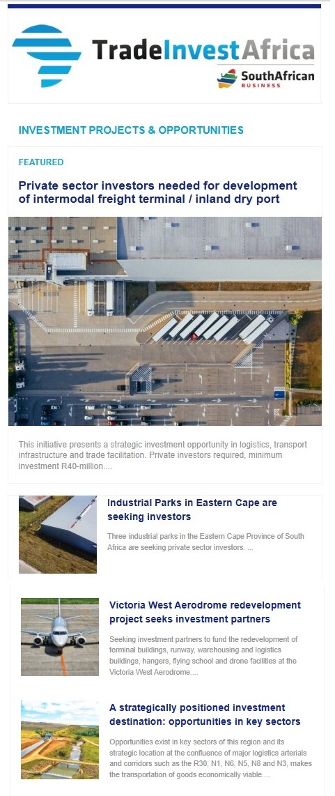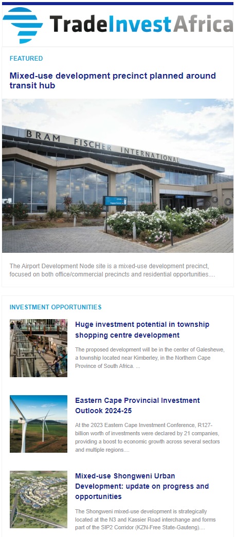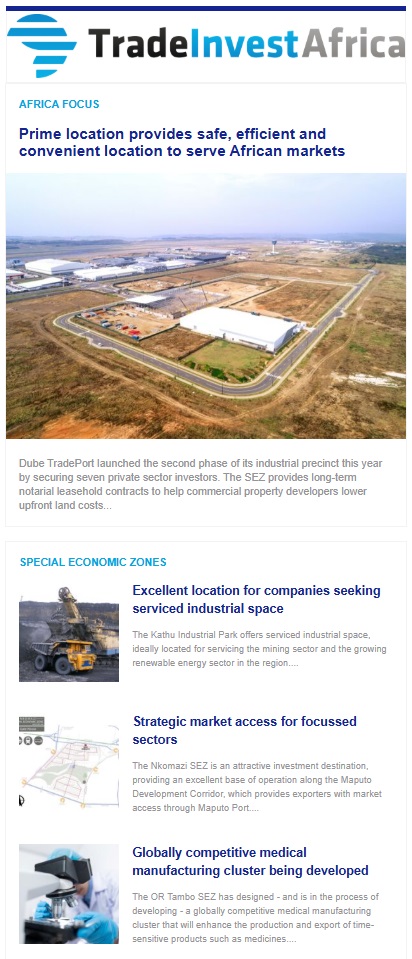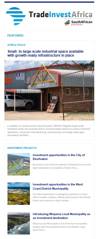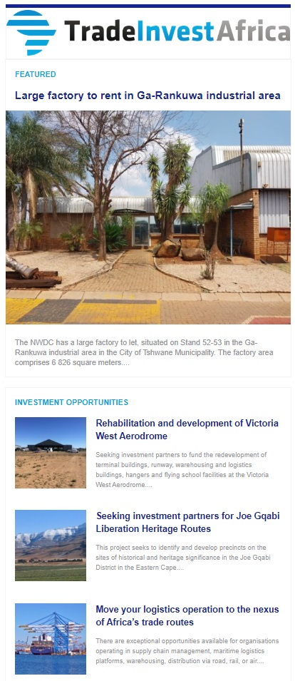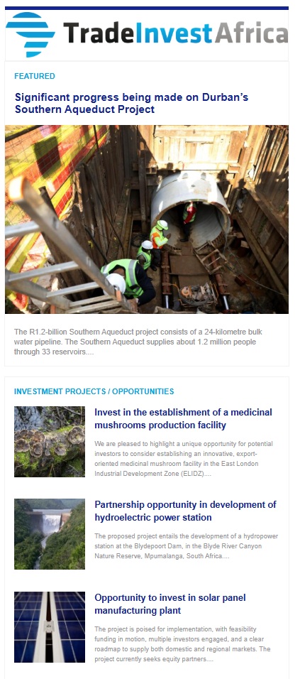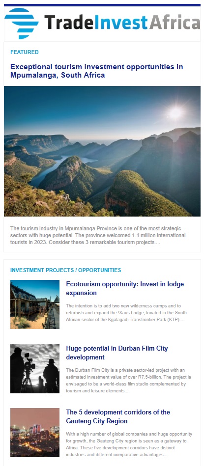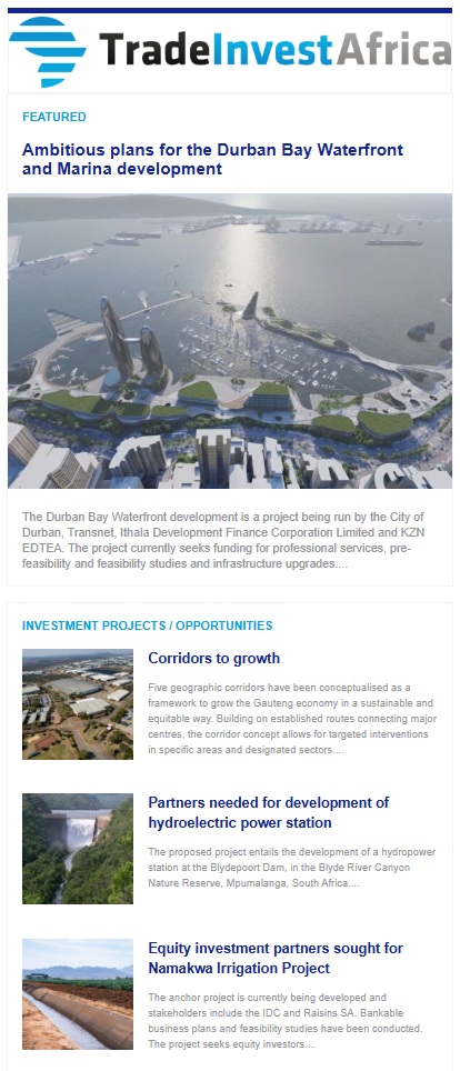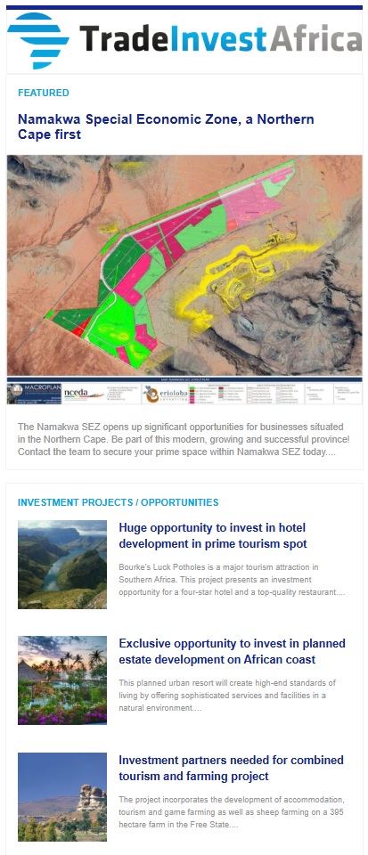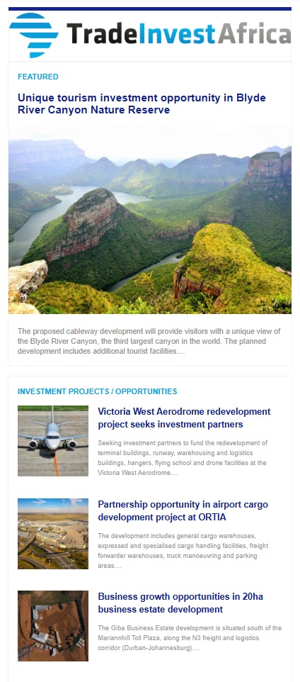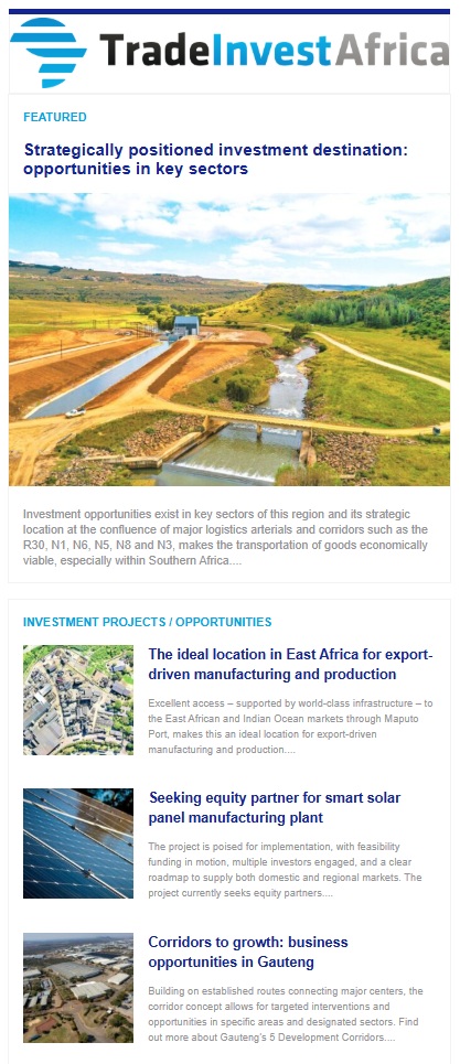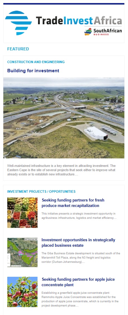 Sign up to receive our monthly TradeInvestAfrica email newsletter containing current business, trade and investment opportunities in Africa. You may also want to sign up for South African Business, a monthly business newsletter focussed on South Africa.