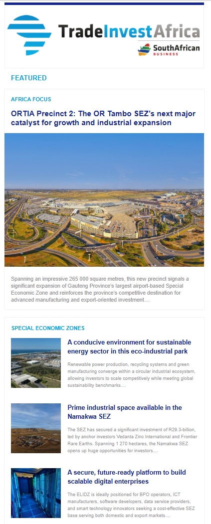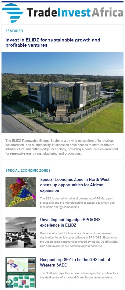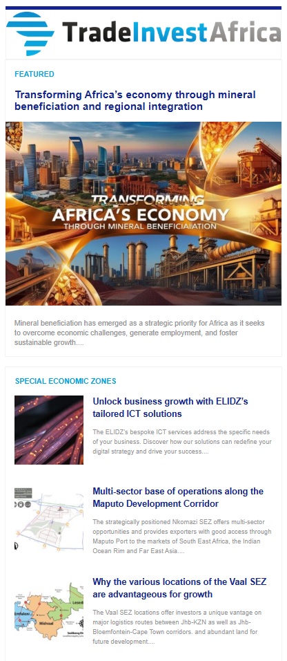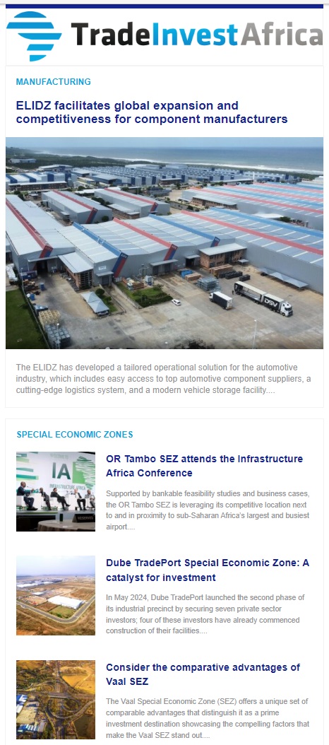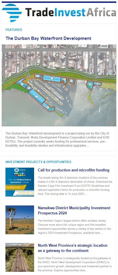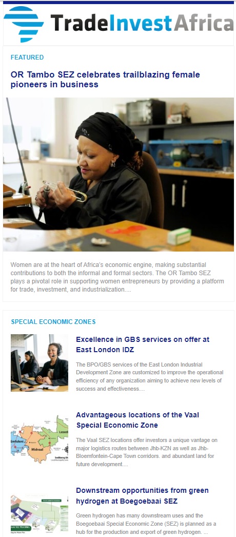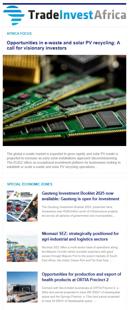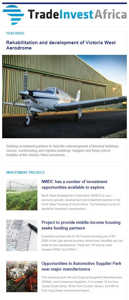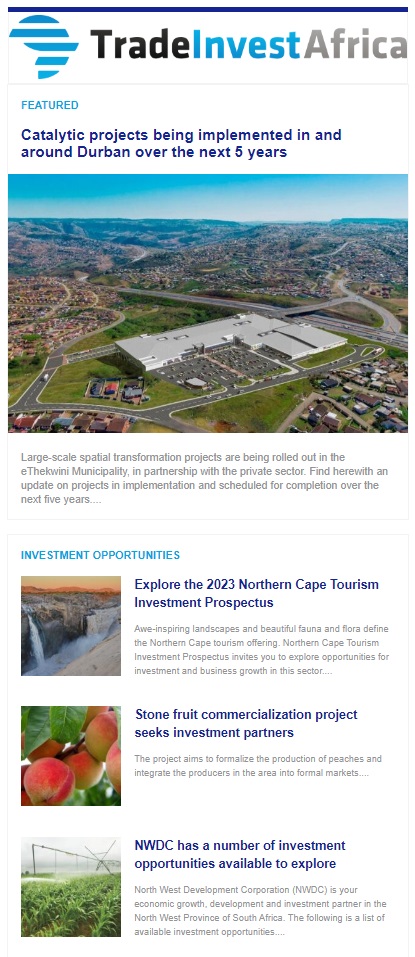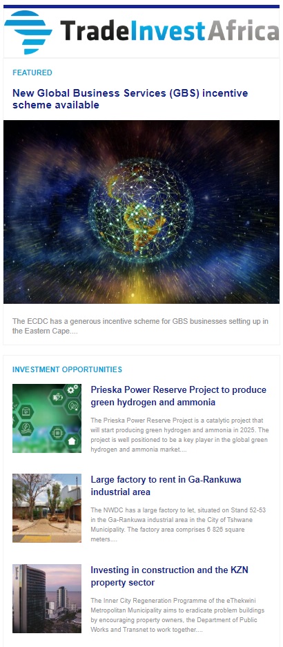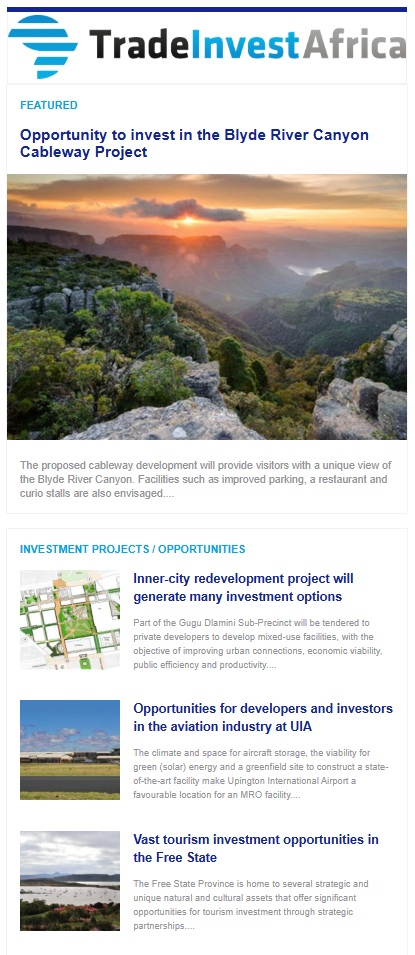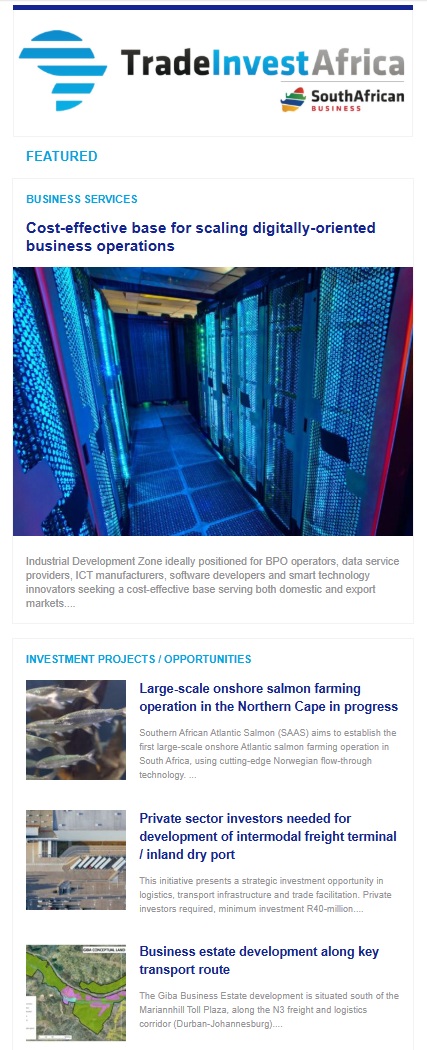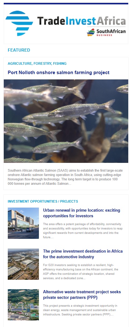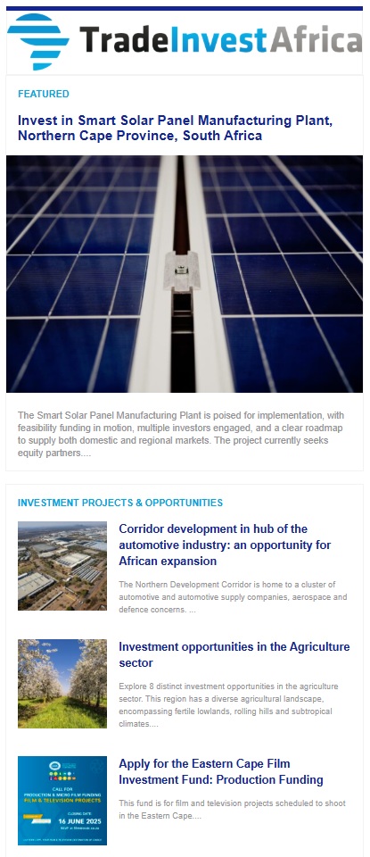 Sign up to receive our monthly TradeInvestAfrica email newsletter containing current business, trade and investment opportunities in Africa. You may also want to sign up for South African Business, a monthly business newsletter focussed on South Africa.