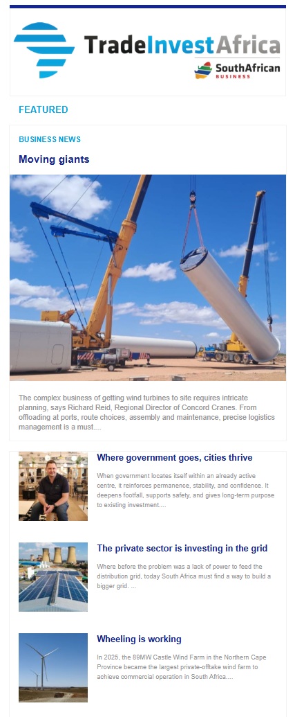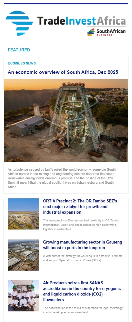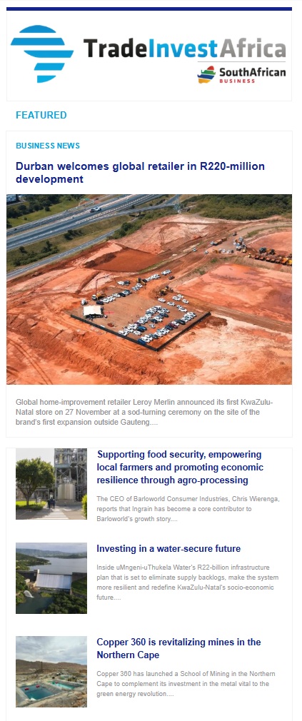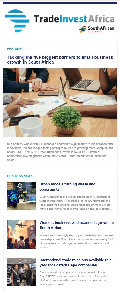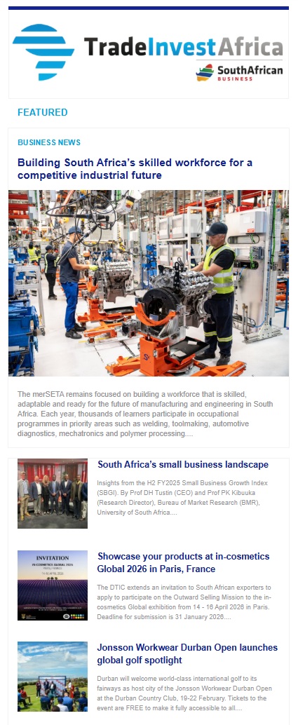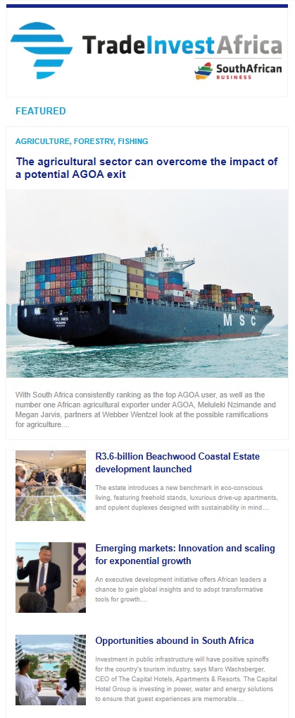 Sign up for TradeInvestAfrica, an email newsletter containing current business, trade and investment opportunities in Africa. Or sign up for South African Business, an email newsletter focused on business and investment news from South Africa.